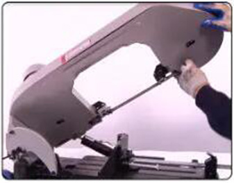 注意:當(dāng)逆時(shí)針旋轉(zhuǎn)鋸片緊固桿以釋放鋸片上的張力時(shí),請(qǐng)將工具指向下方。